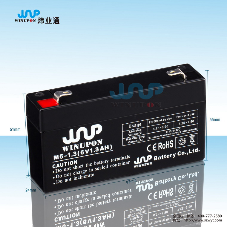 | 規格型號 | 6V1.3AH | 外形尺寸(±2mm) | 約重0.30KG | |||