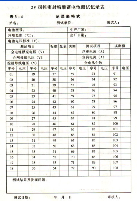 4)2V閥控電池測(cè)試記錄表見表3-4。2v閥控密封鉛酸蓄電池測(cè)試記錄表
