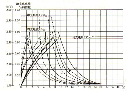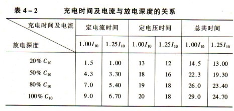 在充電過程中,電池電流在充電前期恒定不變(根據(jù)放電深度不一樣,時間有所不同,如1.0I10時,放電深度為 100%Cl0,時間為9h;1.25I10時,同樣放電深度為l00%,時間為7h),即保持電流l.0I10。蓄電池的端電壓逐漸上升至2.35V/個之后,充電電壓恒定不變。此時充電電流按指數(shù)規(guī)律迅速衰減,在10~20h內(nèi)電流衰減速率變慢,充電結(jié)束前幾小時起,電流不再改變。從圖4—3可看出,充電電流提高時,充電時間可以縮短,而整個充電結(jié)束時問相差不多,見表4—2。