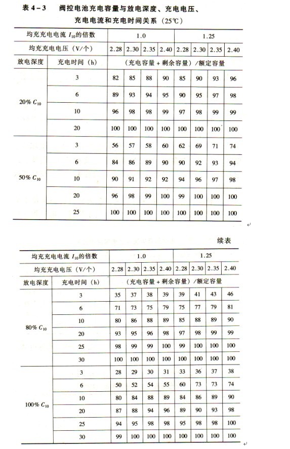 閥控電池的充電容量與放電深度、充電電壓、充電電流和時間的關(guān)系見表4—3。表4—3 閥控電池充電容量與放電深度、充電電壓、充電電流和充電時間關(guān)系(25℃)
