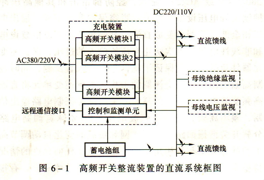 直流系統(tǒng)的蓄電池充電裝置根據(jù)負(fù)荷要求可為幾十安至幾百安。因高頻開關(guān)模塊目前生產(chǎn)的lIOV為10~80A,220V為5~40A,故充電裝置要由多個(gè)模塊并聯(lián)組成,高頻開關(guān)整流裝置的直流系統(tǒng)框圖如圖6-1所示。